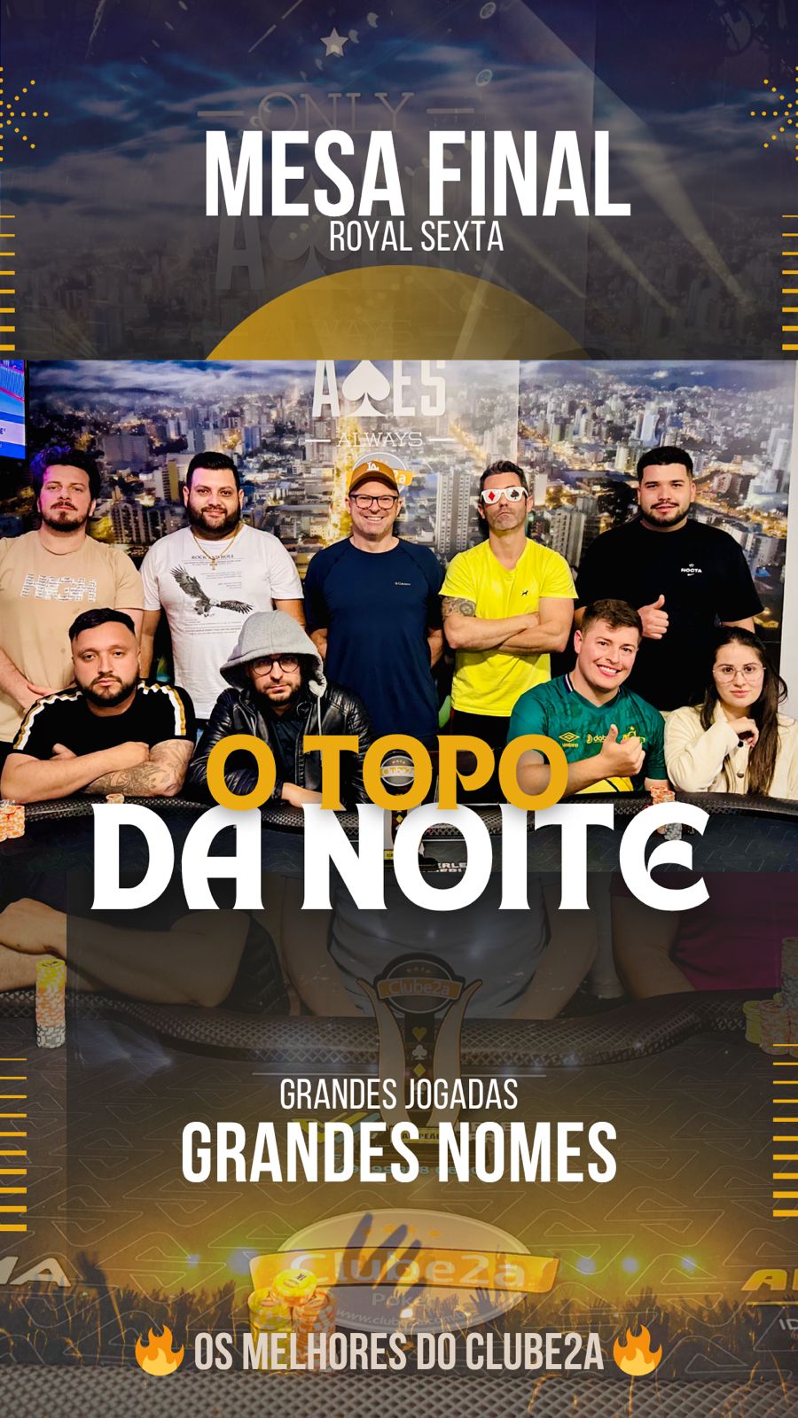 O mês começou daquele jeito no Clube2a: casa cheia, clima elétrico e muitos rostos novos chegando pra mesa! 💪♠️♥️♣️♦️ A galera compareceu em peso e o pote ultrapassou os 12 MIL REAIS, mostrando que a nova temporada promete ser gigante! 💰 Cada mesa foi uma verdadeira batalha — risadas, jogadas incríveis e muita resenha boa do início ao fim. o HU foi lindo, mas Costella vinha numa noite incrível e não deu chances ao azar, cravando a Royal Sexta de hoje!
