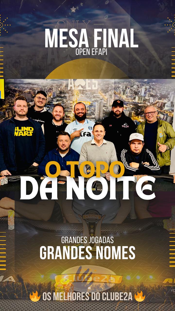 Noite insana no Clube2a! O Open e Efapi 5K garantidos superaram todas as expectativas — casa cheia com 5 mesas rolando do início ao fim, clima de resenha e muito jogo bom! A mesa final foi daquelas de tirar o chapéu, com jogadas de alto nível e muita emoção até o último river. Parabéns ao campeão Guilherme Tonin, que levou o troféu e escreveu seu nome na história do clube! 🏆